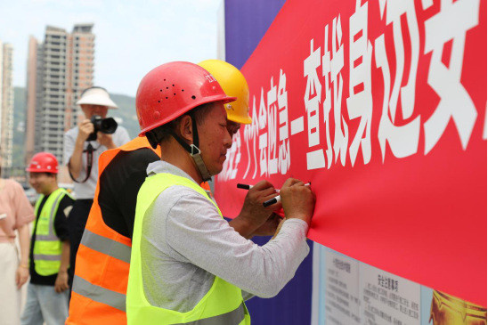 啟動儀式上,公司黨總支副書記、總經(jīng)理馮皓代表業(yè)主單位致辭,宣布安全生產(chǎn)月活動正式啟動。馮皓強調(diào)安全生產(chǎn)對項目建設(shè)的重要性,要求全體人員將安全理念貫穿工作始終,積極參與各項安全活動。并特別指出,張家河生態(tài)修復(fù)項目承載著改善區(qū)域生態(tài)環(huán)境、造福一方百姓的重要使命。作為項目業(yè)主,深知安全生產(chǎn)不僅是項目順利推進的基石、守護建設(shè)者生命安全的防線,更是踐行社會責(zé)任、保障生態(tài)修復(fù)事業(yè)高質(zhì)量發(fā)展的核心要義。隨后,施工單位代表領(lǐng)誓,宣讀了《安全生產(chǎn)誓詞》。緊接著,參與人員在“安全生產(chǎn)月”主題橫幅上簽名,以莊重的形式明確自身安全責(zé)任。