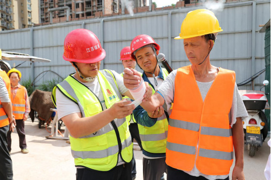 啟動儀式結(jié)束后,項目部工作人員迅速開展聯(lián)合應(yīng)急演練,模擬火災(zāi)、高處墜落等工地典型突發(fā)場景。演練中,現(xiàn)場示范滅火器的操作規(guī)范,講解使用要點,并組織人員進行實操訓(xùn)練,確保人人掌握滅火技能;隨后開展急救包扎演示教學(xué),切實提升人員應(yīng)急救護技能。